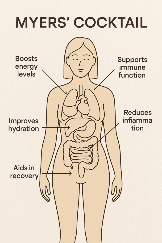A klasszikus Myers-koktél egy precízen összeállított vitamin- és ásványianyag-mix, amelyet intravénásan juttatunk be – így 100%-os hasznosulást biztosít, szemben a szájon át szedett vitaminokkal, amelyek csak részben szívódnak fel.